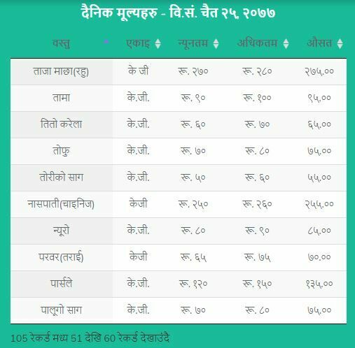 यस्तै च्याउ (कन्य) प्रतिकेजी २३५ रुपैयाँ, च्याउ (डल्ले) प्रतिकेजी ३९० रुपैयाँ, लोकल गाजर प्रतिकेजी ५५ रुपैयाँ, गोलभेडा सानो (टनेल) प्रतिकेजी ५५ रुपैयाँ, ताजा माछा (छडी) प्रतिकेजी २२५ रुपैयाँ, जिरीको साग प्रतिकेजी ५५ रुपैयाँ रहेको छ ।