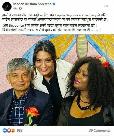 सामाजिक सञ्जाल फेसबुकमा लेख्दै श्रेष्ठले सो कुराको जानकारी दिएका हुन् । उनले लेखेका छन् ‘अब बियोन्सी र म मिलेर अर्को एउटा यूगल गीत गाउने तरखरमा छौं । बियोन्सीको तरुणी स्वरसंग मेरो बुढो स्वर मेल खाला कि नखाला खै… ।’