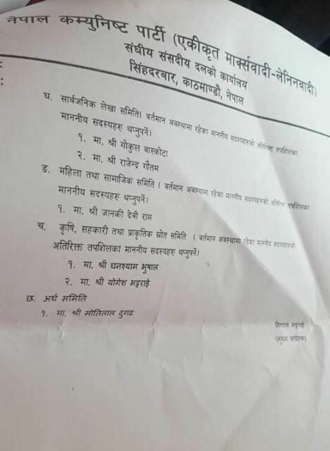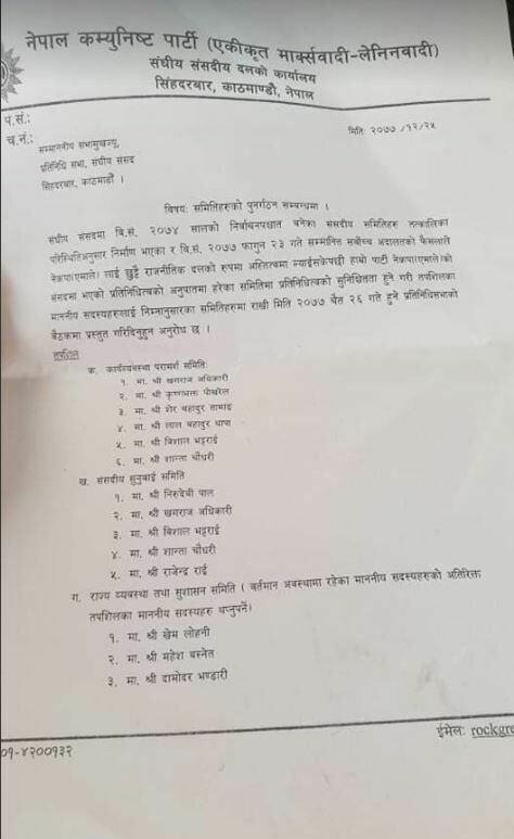 त्यस्तै राज्य व्यवस्था तथा सुशासन समितिमा खेम लोहनी, महेश बस्नेत, दामोदर भण्डारीको नाम थपिएको छ ।