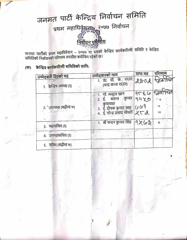 शनिवार सम्पन्न भएको जनमत पार्टीको पहिलो महाधिवेशनबाट सीके राउत सर्वसम्मत अध्यक्ष भएका हुन् ।