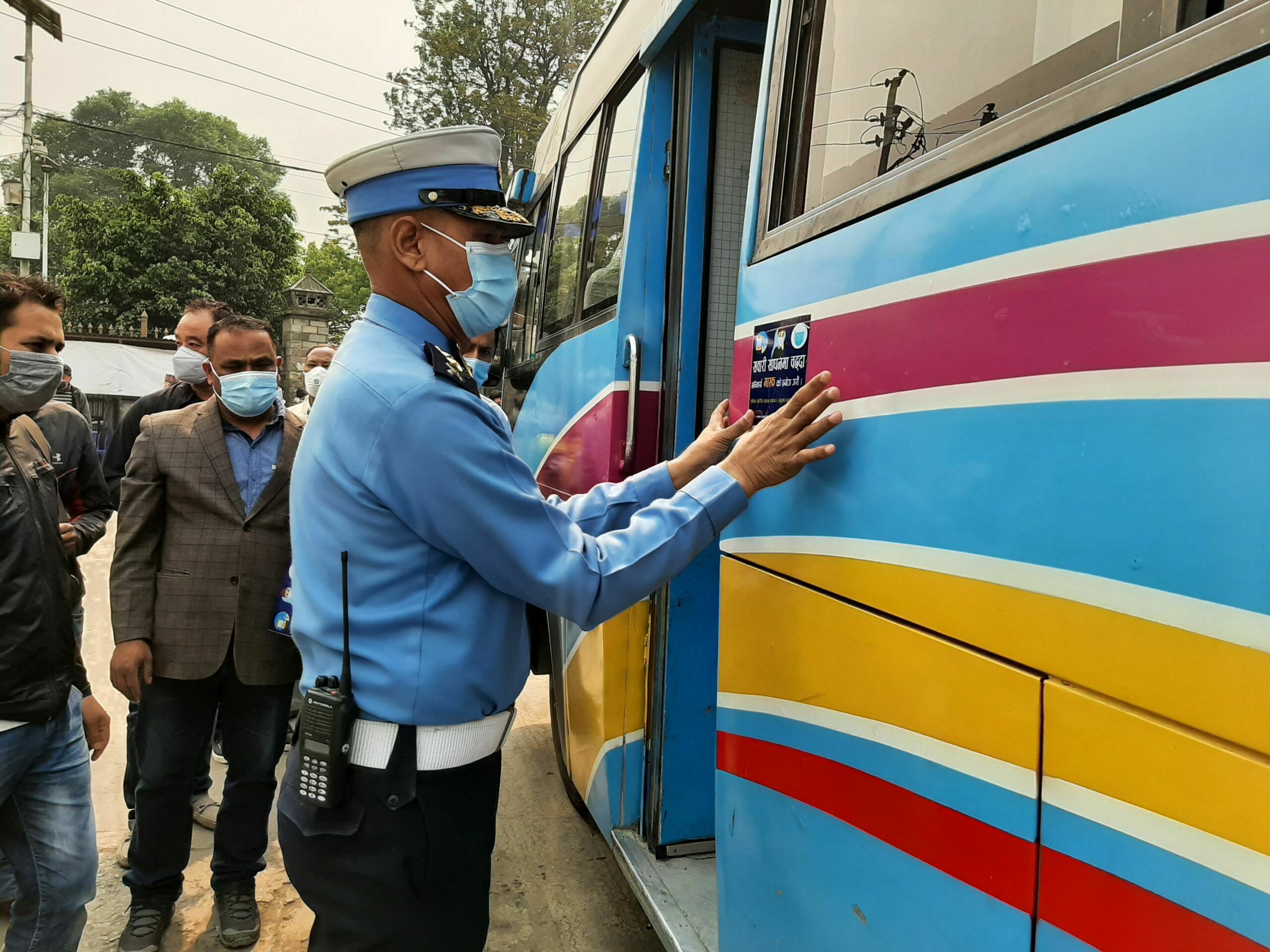 “सवारी साधनमा चढ्दा अनिवार्य मास्कको प्रयोग गरौँ”लेखिएको स्टिँकर उपत्यकामा चल्ने सम्पूर्ण माईक्रो तथा बसहरूमा टाँस गरिने महाशाखाले जनाएको छ ।