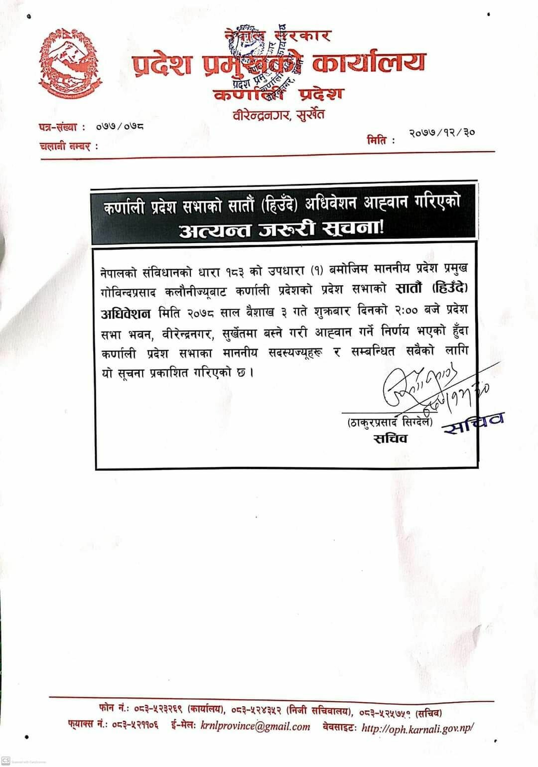 काठमाडौं । कर्णाली प्रदेशको सातौँ (हिँउदे) अधिवेशन आह्वान गरिएको छ ।