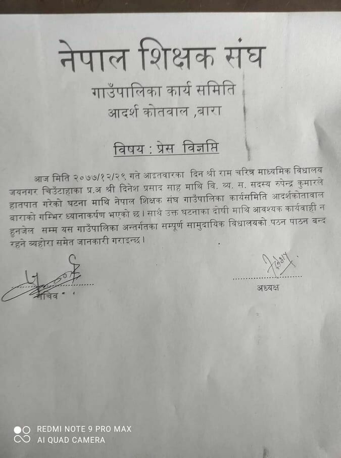 काठमाडौं । बाराको आदर्श कोतवाल गाउँपालिका स्थित श्री राम चरित्र माध्यमिक विद्यालयका प्रधानाध्यापक दिनेश साह माथि कार्यालय परिसरमा हातपात भएको छ ।