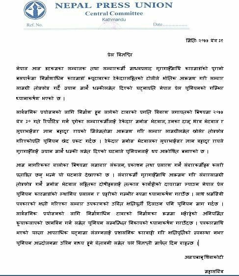 “सार्वजनिक प्रयोजनको लागि निर्माण हुन लागेको टावरको प्रगति विवरण लगायतको बिषयमा २०७७ चैत्र ३० गते रिर्पोटिङ गर्न पुगेका सञ्चारकर्मीलाई ठेकेदार मनोज भेटवाल, उनका दाजु भैरव भेटवाल र सुपरभाईजर ज्ञान बहादुर रायको मिलेमतोमा आक्रमण गरि सञ्चार सामग्रीसमेत खोसेर तोडफोड गरिएकोप्रति युनियन खेद प्रकट गर्दछ । ठेकेदार मनोज भेटवालका सुपरभाईजर ज्ञान वहादुर रायले गुरागाईँलाई ज्यान मार्ने धम्की समेत दिएको घटनाले युनियनलाई थप आक्रोशित बनाएको छ ।” जारी विज्ञप्तिमा भनिएको छ ।