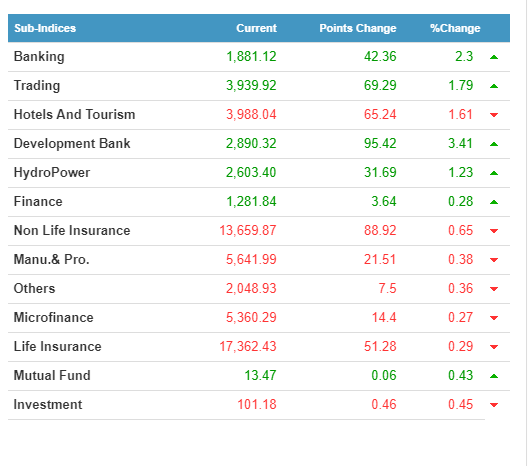 यस दिन ७ अर्ब रुपैयाँ भन्दा बढीको कारोबार भएको छ । त्यस्तै,आज १ करोड १४ लाख भन्दा बढी कित्ता शेयरको किनबेच भएको छ । त्यस्तै, यस दिन ७६ हजार भन्दा बढी वटा कारोबार भएका छन् । मंगलवार बैंकिङ, ट्रेडिङ विकास बैंक,हाइड्रोपावर,वित्त कम्पनी, म्युचिअल फण्ड लगायतका उपसमूहहरुको कारोबार बढेका छ ।