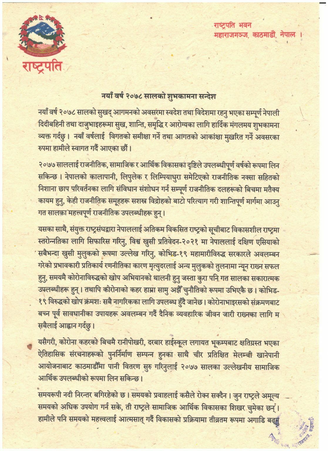 नयाँ वर्ष २०७८ का अवसरमा स्वदेश तथा विदेशमा रहेका नेपालीमा शुभकामना सन्देश दिँदै राष्ट्रपति भण्डारीले नेपालको कालापानी, लिपुलेक र लिम्पियाधुरा समेटिएको राजनीतिक नक्सासहितको निशाना छाप परिवर्तनका लागि संविधान संशोधन गर्न सम्पूर्ण राजनीतिक दलहरूबीचमा मतैक्य कायम हुनु, केही राजनीतिक समूह सशस्त्र विद्रोहको बाटो परित्याग गरी शान्तिपूर्ण मार्गमा आउनु महत्वपूर्ण राजनीतिक उपलब्धि भएको उल्लेख गरेकी छिन् ।