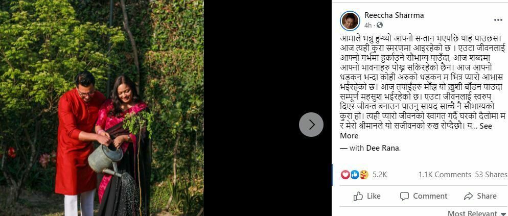 श्रीमान् दिपेक्ष विक्रम राणासँगै सजिवनको रुख रोपेर पानी हाल्दै गरेको तस्बिर सार्वजनिक गर्दै उनी अगाडि लेख्छिन्– ‘त्यही प्यारो जीवनको स्वागत गर्दै घरको दैलोमा म र मेरो श्रीमान्ले सजीवनको रुख रोप्दैछौ । यो नयाँ जीवनको आगमन र यो रुखको अटुट साथ सधै बनिरहोस् भन्ने तपाइहरु सम्पूर्णको आर्शिवादको अपेक्षा गर्दछु । मेरी आमा पनि पर क्षितिजबाट भन्दै हुनुहुन्छ होला, छोरी आज ठूली भई ।’