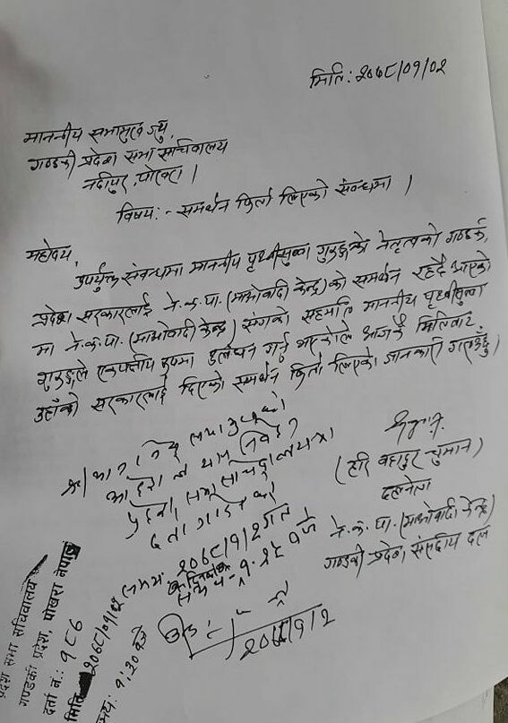 माओवादी केन्द्र गण्डकी प्रदेश संसदीय दलको कार्यालयले प्रदेश सभा सचिवालयलाई पत्र लेख्दै मुख्यमन्त्री गुरुङले आफूखुसी एकलौटी निर्णय गर्दै आएको भन्दै समर्थन फिर्ता लिएको जानकारी गराएको छ ।