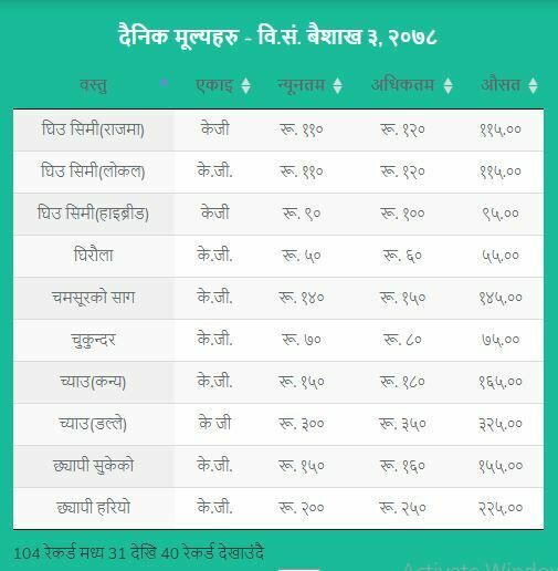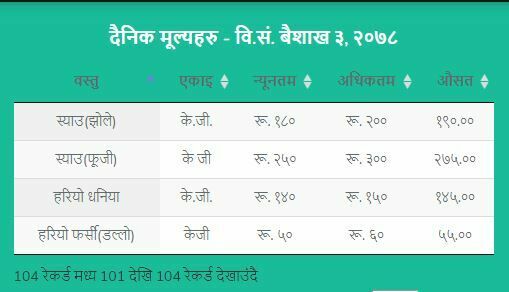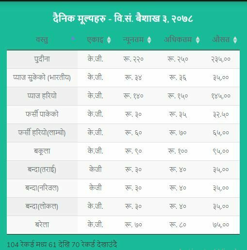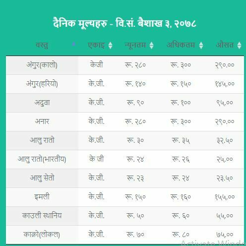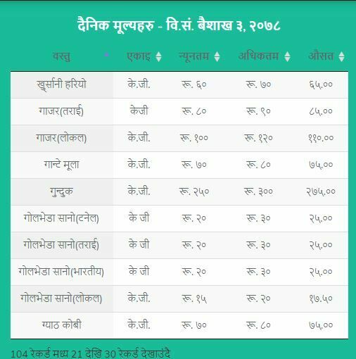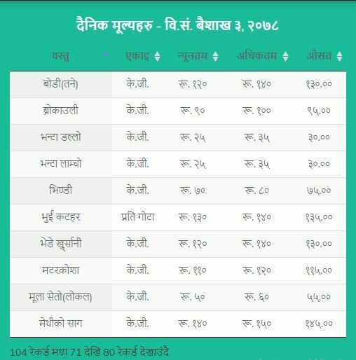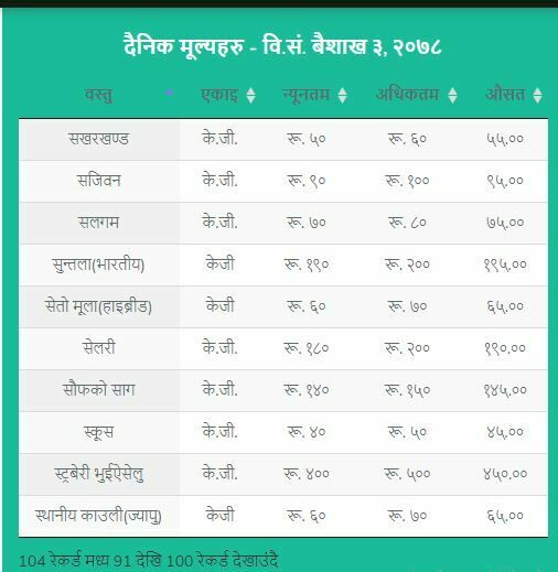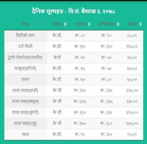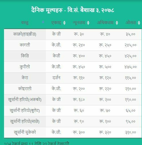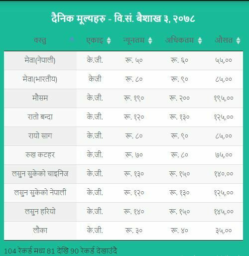 जसअनुसार अंगुर (कालो) प्रतिकेजी २९० रुपैयाँ, अंगुर (हरियो) प्रतिकेजी १४५ रुपैयाँ, अनार प्रतिकेजी २९० रुपैयाँ, आलु रातो प्रतिकेजी ३२ रुपैयाँ ५० पैसा, आलु तेतो प्रतिकेजी २३ रुपैयाँ ५० पैसा, काउली (स्थानीय) प्रतिकेजी ५५ रुपैयाँ, काक्रो (लोकल) प्रतिकेजी ७५रुपैयाँ, इमली प्रतिकेजी १५५ रुपैयाँ, कागती प्रतिकेजी २४५ रुपैयाँ, किवि प्रतिकेजी ४२५ रुपैयाँ, कुरीलो प्रतिकेजी ४७५ रुपैयाँ, कोइरालो प्रतिकेजी २१० रुपैयाँ, खुर्सानी हरियो (अखबरे) प्रतिकेजी १९० रुपैयाँ, खुर्सानी सुकेको प्रतिकेजी ३१० रुपैयाँ रहेको विकास समितिले जनाएको छ ।