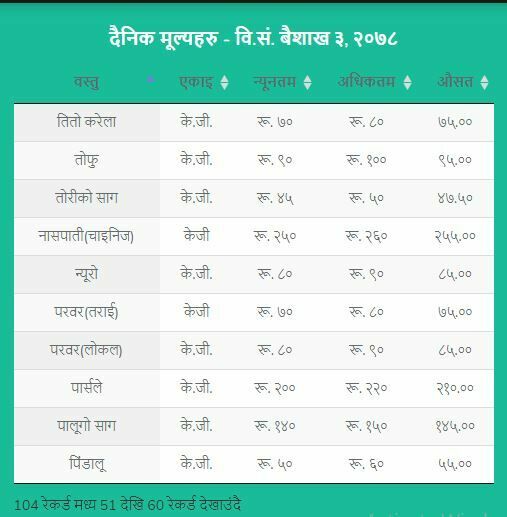 यस्तै तितो करेला प्रतिकेजी ७५ रुपैयाँ, तोफु प्रतिकेजी ९५ रुपैयाँ, नासपाती (चाइनिज) प्रतिकेजी २५५ रुपैयाँ, पार्सले प्रतिकेजी २१० रुपैयाँ, पालूगो साग प्रतिकेजी १४५ रुपैयाँ, पुदीना प्रतिकेजी २३५ रुपैयाँ, प्याज सुकेको (भारतीय) ३५ रुपैयाँ, प्याज हरियो प्रतिकेजी १४५ रुपैयाँ रहेको छ ।