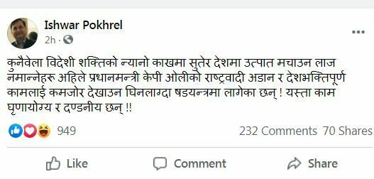 सामाजिक सञ्जालमा लेख्दै उनले, ‘कुनै वेला विदेशी शक्तिको न्यानो काखमा सुतेर देशमा उत्पात मचाउन लाज नमान्नेहरू अहिले प्रधानमन्त्री केपी ओलीको राष्ट्रवादी अडान र देशभक्तिपूर्ण कामलाई कमजोर देखाउन घिनलाग्दा षड्यन्त्रमा लागेका छन् ! यस्ता काम घृणायोग्य र दण्डनीय छन् !!’