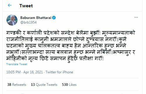 डा. भट्टराईले गण्डकी र कर्णाली प्रदेशको सन्देश भष्मासुर र मोहिनीको नृत्य छिट्टै समापन हुँदैछ भन्दै सामाजिक सञ्जाल ट्वीटरमा लेखेका छन् । उनले कर्णालीले मूल्यमान्यताको राजनीतिलाई कानुनले नछेक्ने सन्देश दिएकोसमेत स्पष्ट ट्वीटमा लेखेका छन् ।