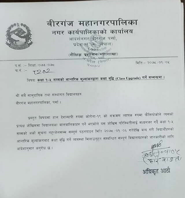 वीरगञ्ज । कोरोना भाइरसको जोखिम बढेपछि वीरगञ्जका विद्यालयहरू भोलि (सोमवार) देखि बन्द हुने भएका छन् ।