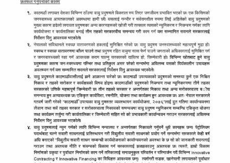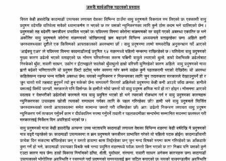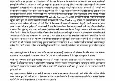 कोरोनाको कहरका दौरान वायु प्रदूषणले थप समस्या निम्त्याएको भन्दै यसको मूलभूत कारणहरु पत्ता लगाइ समाधान खोज्नुपर्ने मागसहित प्रस्तावमा सम्बन्धित निकायको ध्यानाकर्षण गर्न खोजिएको छ ।