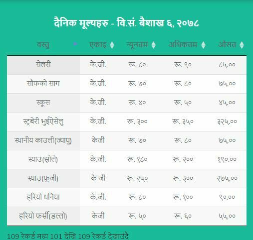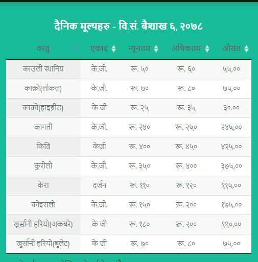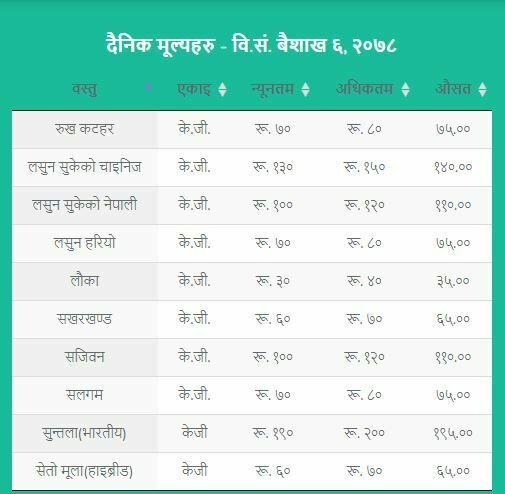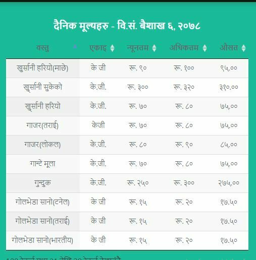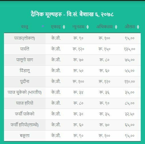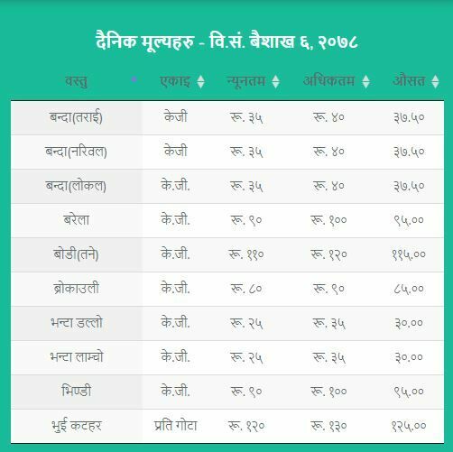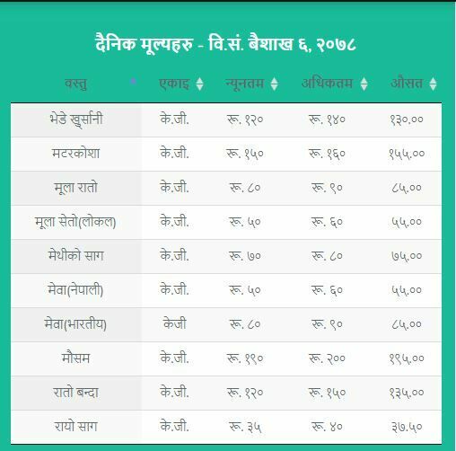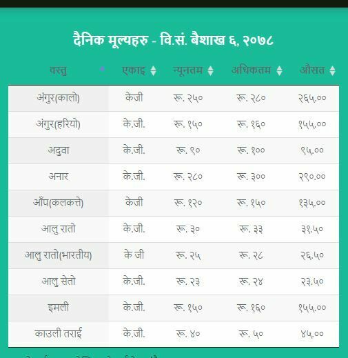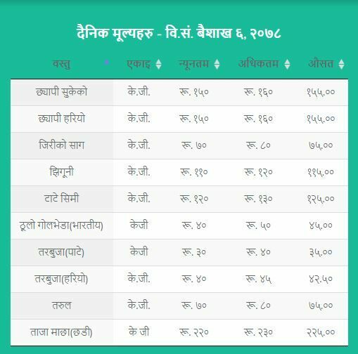 जसअनुसार अगुंर (कालो) प्रतिकेजी २६५  रुपैयाँ, अंगुर (हरियो) प्रतिकेजी १५५ रुपैयाँ, अनार प्रतिकेजी २९० रुपैयाँ, अदुवा प्रतिकेजी ९५ रुपैयाँ, आलु रातो प्रतिकेजी ३१ रुपैयाँ ५० पैसा , आलु सेता प्रतिकेजी २३ रुपैयाँ ५० पैसा , इमली प्रतिकेजी १५५ रुपैयाँ, काउली तराई प्रतिकेजी ४५ रुपैयाँ रहेको विकास समितिले जनाएको छ ।
