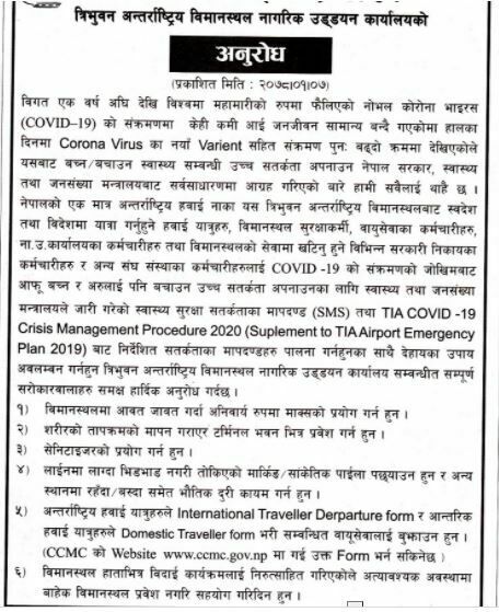त्यस्तै विमानस्थलमा प्रवेश गर्दा मास्कलगायत स्यानिटाइजरको प्रयोग, तापक्रम नापेर मात्र टर्मिनलमा प्रवेश गर्न र लाइन बस्दा सांकेतिक पाइला पच्छ्याउन आग्रह गरेको छ।