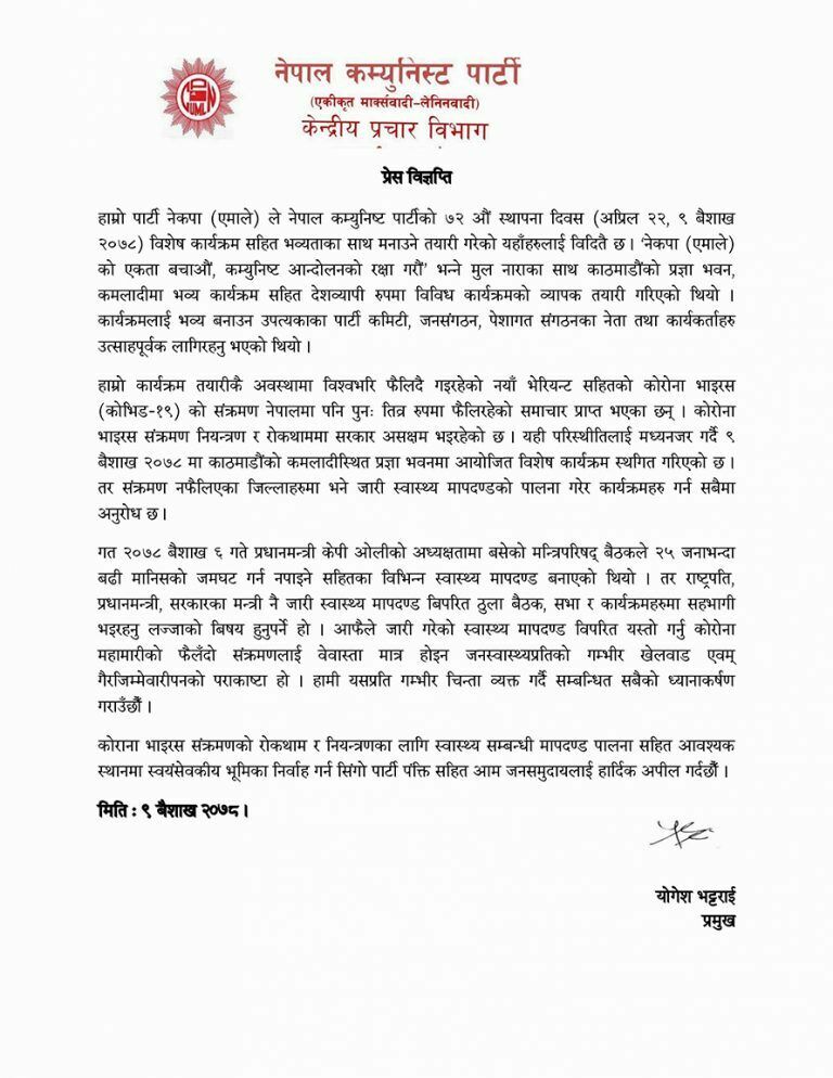 आज मंगलवार एक विज्ञप्ती प्रकाशित गर्दै प्रचार विभाग प्रमुख योगेश भट्टराईले कम्युनिष्ट पार्टी स्थापनाको दिन ( बैशाख ९) नेपाल प्रज्ञा प्रतिष्ठान भवनमा आयोजित कार्यक्रम स्थगित गरिएको जनाएका हुन् । विज्ञप्तीमा भट्टराईले कोरोनाको संक्रमण कम भएका जिल्लामा भने कार्यक्रम नरोक्न उल्लेख गरेका छन् ।