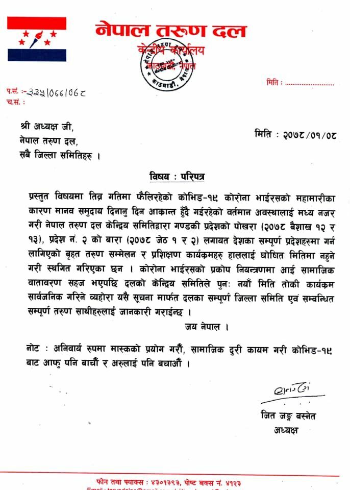 बुधवार सम्पूर्ण जिल्ला समितिहरुलाई पत्र लेख्दै अध्यक्ष जितजंग बस्नेतले ति कार्यक्रमहरु पूर्व निर्धारित मितिमा नहुने बताएका जानकारी दिए ।
