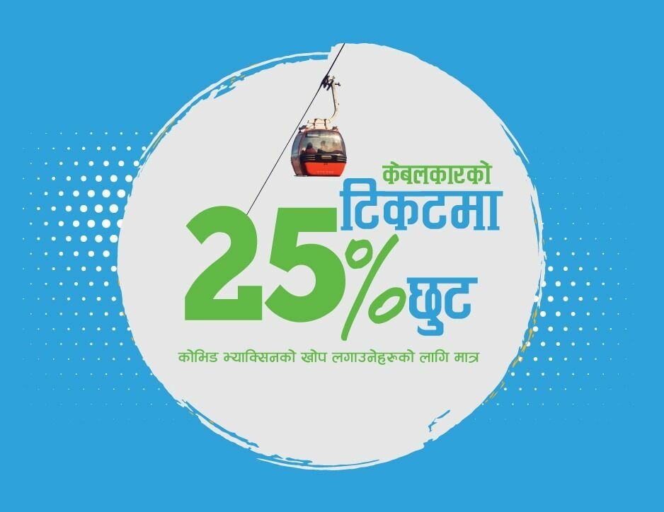 काठमाडौं । कोभिड– १९ विरुद्ध खोप लगाउनेहरूलाई चन्द्रागिरि केवलकार यात्रामा २५ प्रतिशत छुटको व्यवस्था गरिएको छ ।