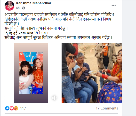 उनले भनिन्- ‘आदरणीय मदनकृष्ण दाइको सपरिवार र केकि बहिनीलाई पनि कोरोना पोजिटिभ देखिएकोले केही लक्षण नदेखिए पनि आफू पनि केही दिन एकान्तमा बस्ने निर्णय गरेको छु । सम्पुर्ण को सिघ्र स्वास्थ लाभको कामना गर्दछु । दिनहु दुई पटक बाफ लिने गरु । सबैलाई अन्य सम्पूर्ण सुरक्षा बिधिहरु अनिवार्य रूपमा अपनाउन अनुरोध गर्दछु ।’