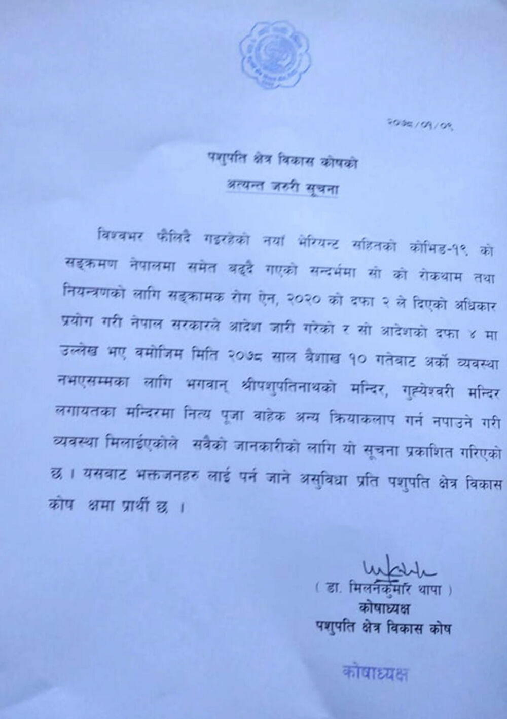 कोषका कोषाध्यक्ष डा. मिलनकुमार थापाले एक सुचना प्रकाशित गर्दै वैशाख १० गतेबाट अर्को व्यवस्था नभएसम्मका लागि श्री पशुपतिनाथको मन्दिर, गुहेश्वरी मन्दिरलगायतका मन्दिरमा नित्य पूजाबाहेक अन्य क्रियाकलाप गर्न नपाउने गरी व्यवस्था मिलाइएको जनाएका छन् ।