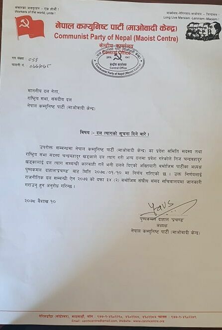 माओवादी केन्द्र राष्ट्रिय सभा संसदीय दलका नेता दीनानाथ शर्माले पत्र लेख्दै त्यसबारे जानकारी गराएका छन् ।
