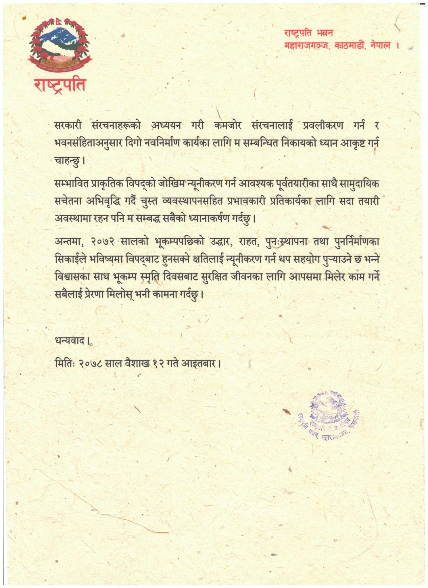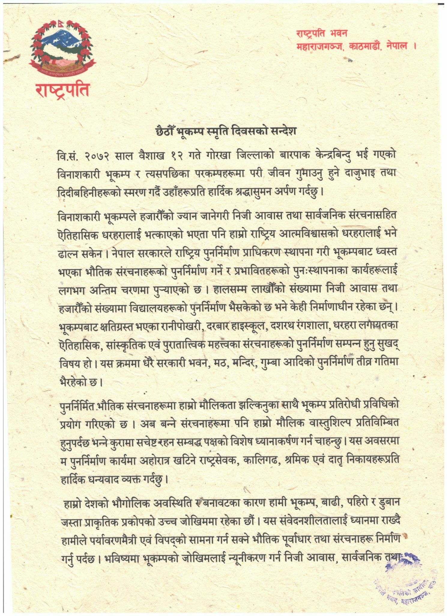 ‘विनाशकारी भूकम्पले हजारौँको ज्यान जानेगरी निजी आवास तथा सार्वजनिक संरचनासहित ऎतिहासिक धरहरालाई भत्काएको भएता पनि हाम्रो राष्ट्रिय आत्मविश्वासको धरहरालाई भने ढाल्न सकेन । नेपाल सरकारले राष्ट्रिय पुनर्निर्माण प्राधिकरण स्थापना गरी भूकम्पबाट ध्वस्त भएका भौतिक संरचनाहरूको पुनर्निर्माण गर्ने र प्रभावितहरूको पुनःस्थापनाका कार्यहरूलाई लगभग अन्तिम चरणमा पुर्याएको छ । हालसम्म लाखौँको संख्यामा निजी आवास तथा हजारौँको संख्यामा विद्यालयहरूको पुनर्निर्माण भैसकेको छ भने केही निर्माणाधीन रहेका छन् । भूकम्पबाट क्षतिग्रस्त भएका रानीपोखरी‚ दरबार हाइस्कूल‚ दशरथ रंगशाला, धरहरा लगायतका ऎतिहासिक‚ सांस्कृतिक एवं पुरातात्त्विक महत्त्वका संरचनाहरूको पुनर्निर्माण सम्पन्न हुनु सुखद् विषय हो । यस क्रममा धेरै सरकारी भवन‚ मठ‚ मन्दिर‚ गुम्बा आदिको पुनर्निर्माण तीव्र गतिमा भैरहेको छ ।” जारी सन्देशमा भनिएको छ ।