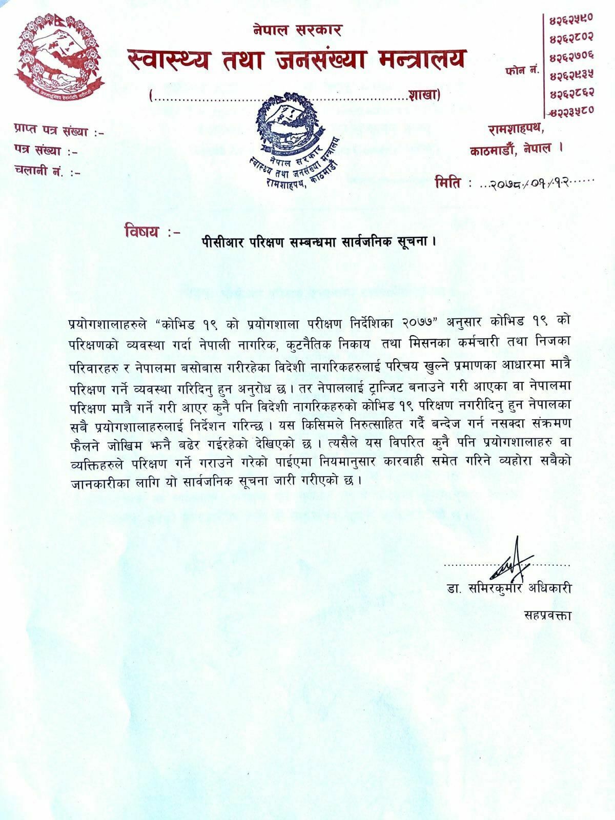 मन्त्रालयका सहप्रवक्ता डा.समीरकुमार अधिकारीले भने- ‘प्रयोगशालाहरुले “कोभिड ज्ञढ को प्रयोगशाला निर्देशीका २०७७” अनुसार कोभिड १९ को परीक्षणको व्यवस्था गर्दा नेपाली नागरिक, कुटनैतिक निकाय तथा मिसनका कर्मचारी तथा निजका परिवारहरु र नेपालमा बसोबास गरिरहेका विदेशी नागरिकहरुलाई परिचय खुल्ने प्रमाणका आधारमा मात्रै परीक्षण गर्ने व्यवस्था गरिदिनुहुन अनुरोध छ । तर नेपालमा ट्रान्जिट बनाउने गरी आएका वा नेपालमा मात्रै कोरोना परीक्षण गर्ने गरी आएर कुनैपनि विदेशी नागरिकहरुको कोभिड(१९ परीक्षण नगरीदिनुहुन नेपालका सबै प्रयोगशालाहरुलाई निर्देशन गरिन्छ ।’