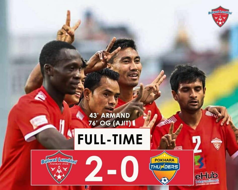 पहिलो हाफको ४२औं मिनेटमा बुटवल लुम्बिनीका लागि अफ्रीकी स्ट्राइकर अर्माण्ड बेडुमले हेडर गोल गर्दै १–० को अग्रता दिलाए । खेलको दोस्रो मिनेटमै वान अन् वान मौका खेर फालेका बेडुमले यस पटक मान बहादुर परियारको क्रस व्यर्थ जन दिएनन् ।