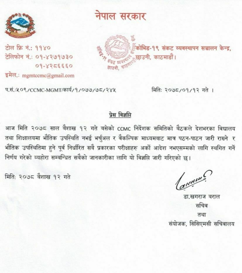आइतबार बसेको कोभिड १९ संकट व्यवस्थापन सञ्चालन केन्द्र निर्देशक समितिको बैठकले पूर्व निर्धारित सबै प्रकारका परिक्षाहरु अर्को आदेश नभएसम्मको लागि स्थगित गर्ने निर्णय गरेको हो ।