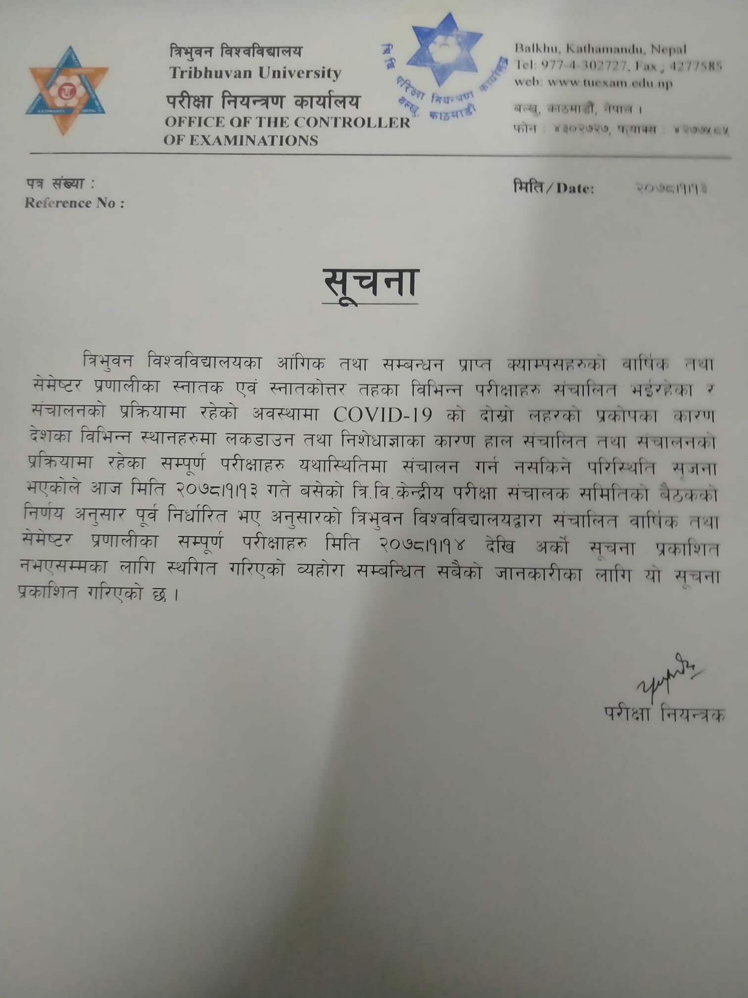 काठमाडौं । नेपालमा कोरोना संक्रमणको जोखिम बढेसँगै त्रिभुवन विश्वविद्यालयले सम्पूर्ण परीक्षाहरु स्थगित गर्ने निर्णय गरेको छ ।