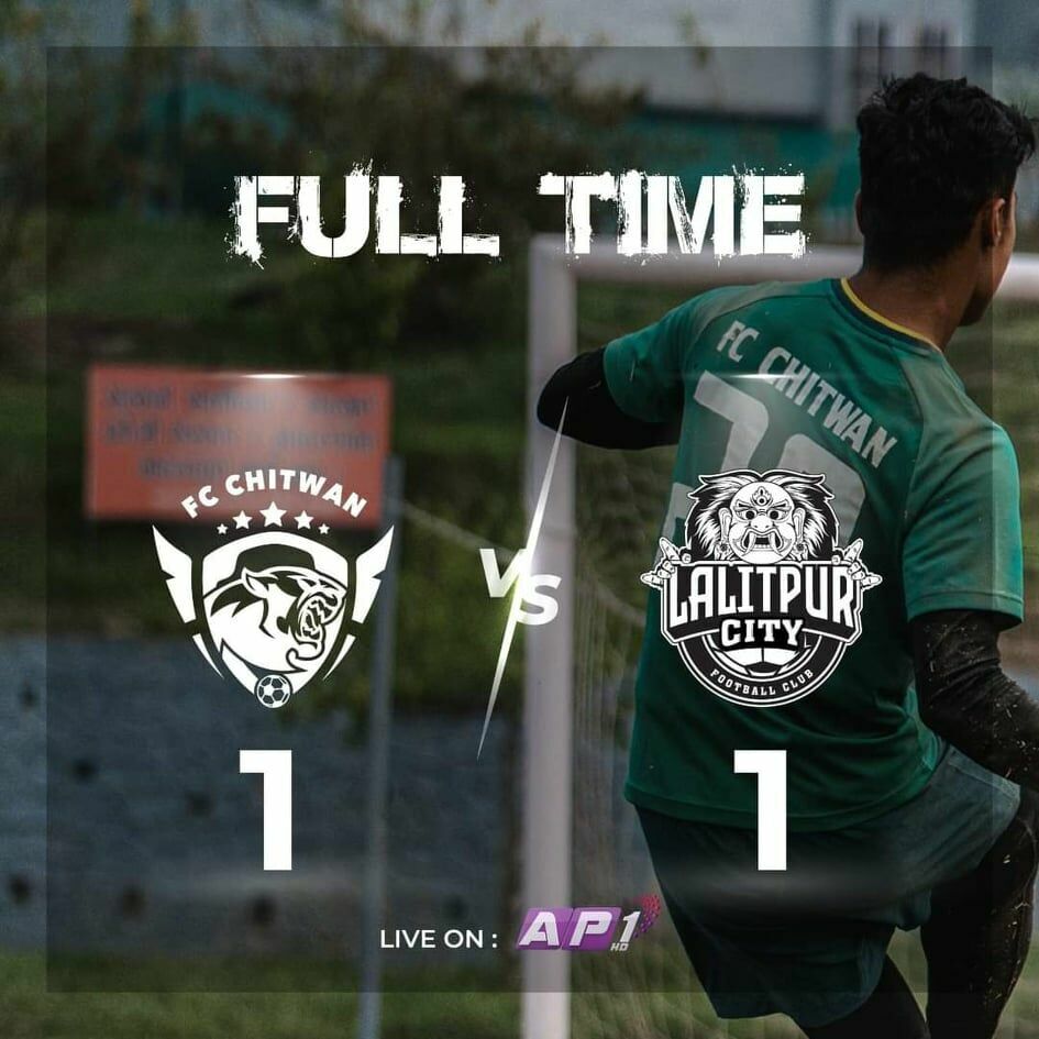 दशरथ रंगशालामा सोमवार साँझ खेलिएको खेलमा ललितपुर र चितवनले १–१ गोलको बराबरी खेल खेलेका हुन् । ललितपुरका कमल श्रेष्ठले दोस्रो हाफको सुरुवातमा गरेका गोललाई चितवनका अमित तामाङको गोलले फच्या गरेपछि खेल बराबरीमा सकिएको हो ।