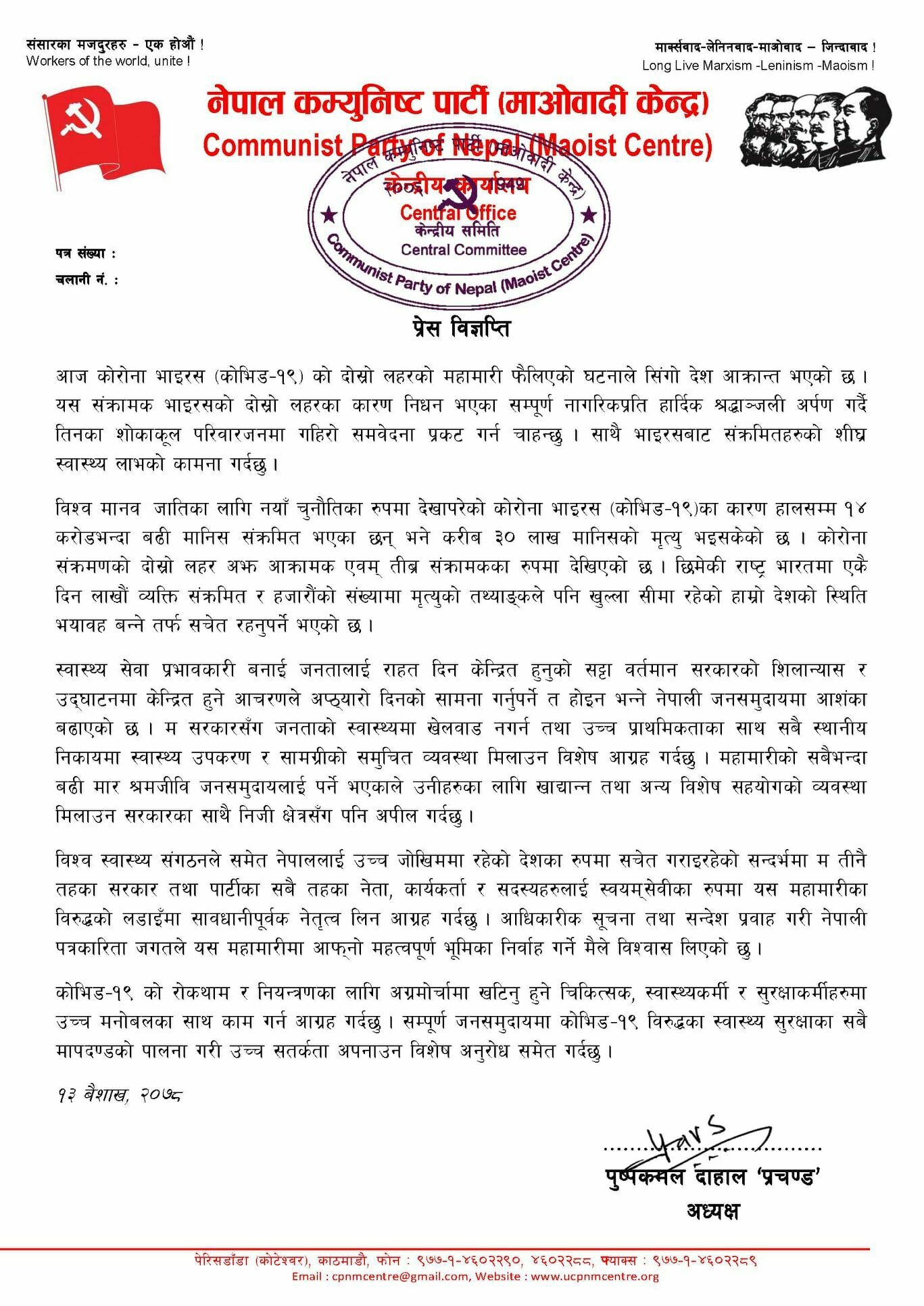 अध्यक्ष दाहालले आज साँझ एक विज्ञप्तिमार्फत भनेका छन्, “स्वास्थ्य सेवा प्रभावकारी बनाई जनतालाई राहत दिन केन्द्रित हुनेको सट्टा वर्तमान सरकारको शिलान्यास र उद्घाटनमा केन्द्रित हुने आचरणले अप्ठ्यारो दिनको सामना गर्नुपर्ने त होइन भन्ने नेपाली जनसमुदायमा आशङ्का बढाएको छ ।”