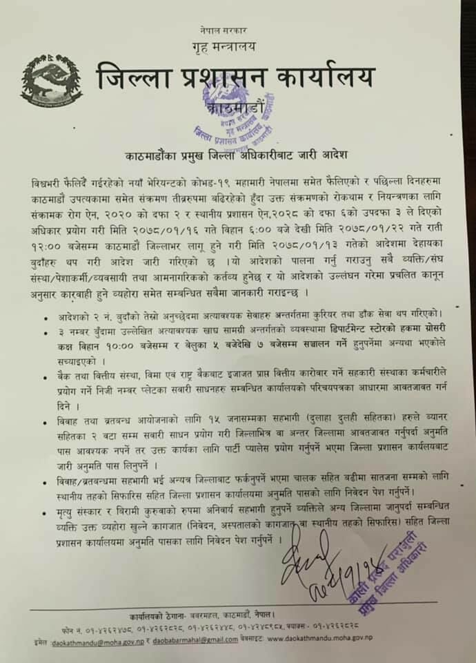 काठमाडौं । जिल्ला प्रशासन कार्यालय काठमाडौंले जारी गरेको निषेधाज्ञाको सम्बन्धमा थप आदेश जारी गरेको छ ।
