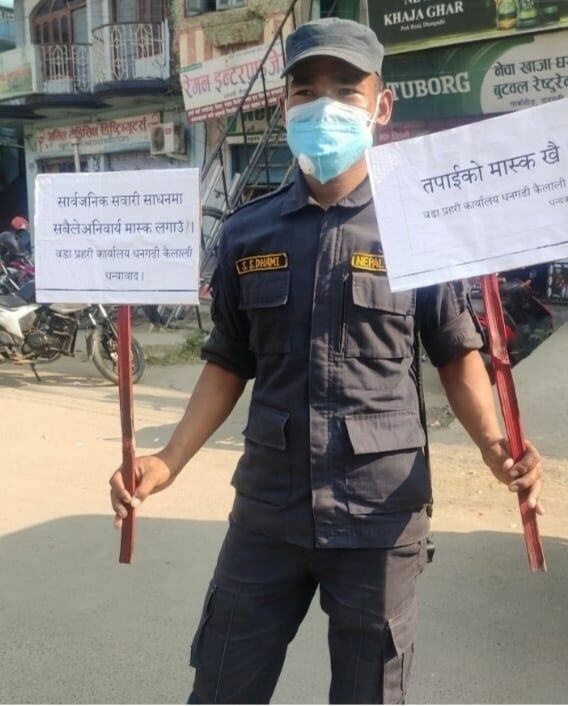 टेकसिंह धामी, धनगढी । सुदूरपश्चिममा कोरोनाको दोस्रो लहर फैलिन थालेपछि प्रहरीले प्रदेशको अस्थायी मुकाम धनगढीमा ’तपाइको मास्क खोइ ?’ अभियान थालेको छ। कोरोनाको जोखिम बढेको भन्दै सर्वसाधारणलाई मास्क लगाउन अनुरोधका साथ प्रहरीले उक्त अभियान थालेको हो ।