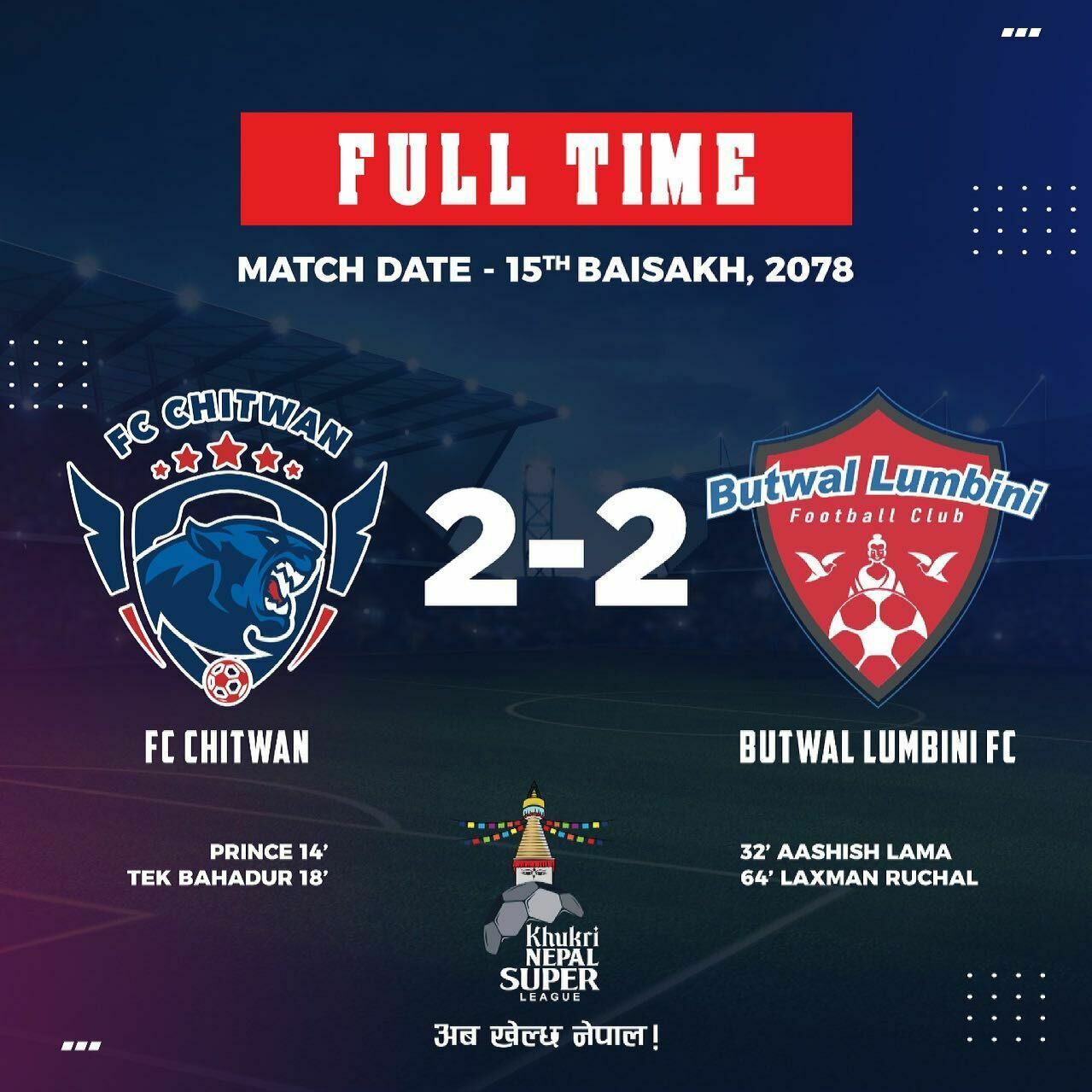 काठमाडौं। नेपाल सुपर लिग (एनएसएल) मा आज (बुधवार) भएको पहिलो खेलमा एफसी चितवनले बुटवल लुम्बिनी एफसीसँग २-२ गोलको बराबरी खेल खेलेको छ।