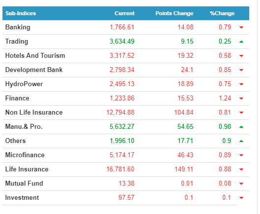 बुधवार २ सय १५ कम्पनीको ९० लाख कित्ता सेयर किनबेच भएको छ भने सो किनबेचपछि ३ अर्ब ९८ करोड रुपैयाँ बराबरको कारोबार भएको छ । बुधवार ४६ हजार वटा कारोबार भएको छ । व्यापार, उत्पादन र अन्य समूहको सूचक मात्रै बढेका छन् भने अन्य सबै उपसमूहको सूचक राताम्मे भएको छ । आज जीवन बीमा समूहको कारोबार १५० अंकले घटेको छ भने निर्जीन बीमा समूह १०४ अंकले घटेको नेपाल स्टक एक्चेन्ज(नेप्से) ले जनाएको छ ।
