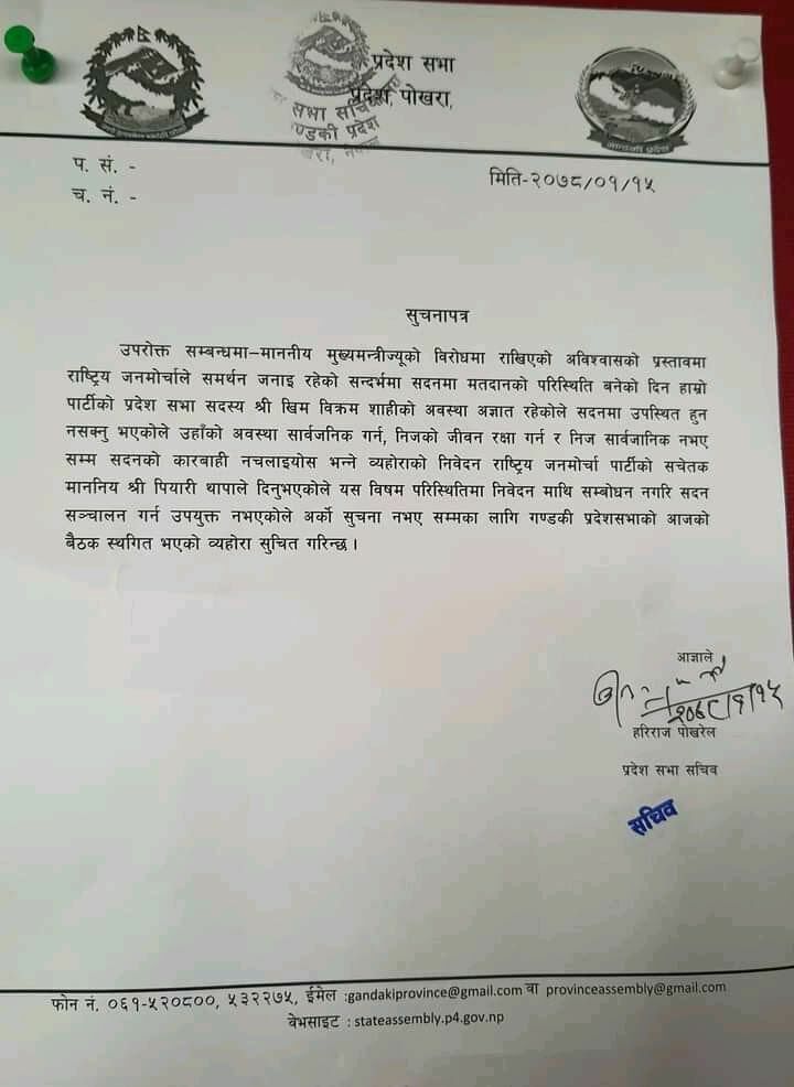 गण्डकी प्रदेश : जनमोर्चाका एक सांसद गायब, अनिश्चितकालका लागि बैठक स्थगित