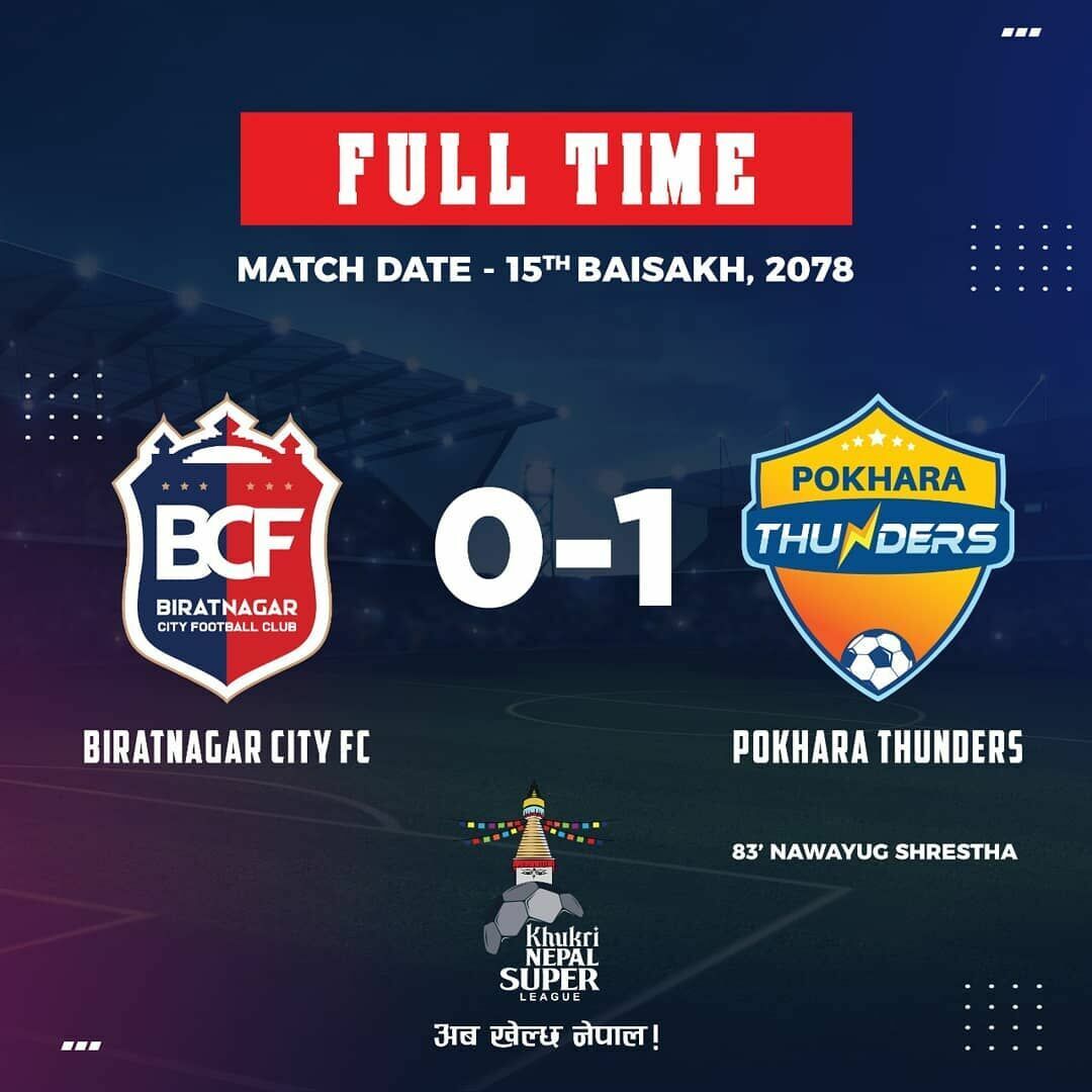काठमाडौं। नेपाल सुपर लिग (एनएसएल) मा आज (बुधवार) भएको देश्रो खेलमा पोखरा थन्डर्सले विराटनगर सिटी एफसीलाई १-० गोलले पराजित गर्दै यस संस्करणमा आफ्नो गोल तथा अंकको खाता खोलेको छ।