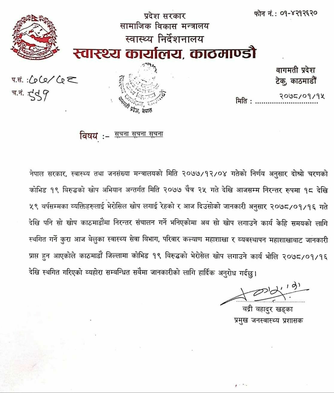 काठमाडौं । सरकारले बिहीवार (आज) देखि कोरोनाविरुद्दको खोप अभियान स्थगित गरेको छ ।