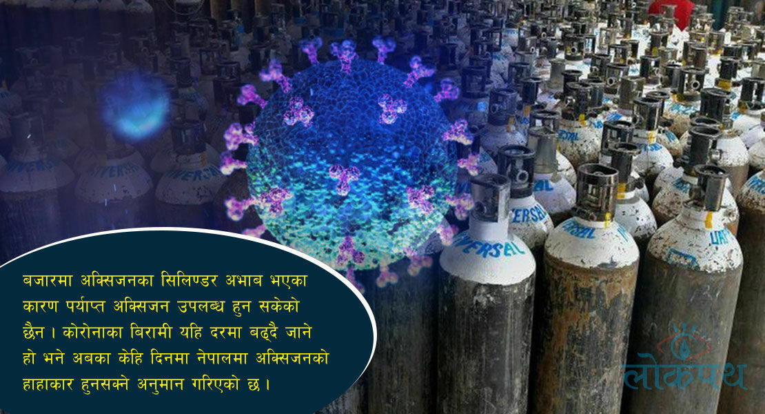 अक्सिजन प्रयाप्त मात्रामा भएपनि सिलिन्डर पर्याप्त नहुँदा कोरोना संक्रमितको उपचार गर्न समस्या भएको छ । अहिले अस्पतालहरुमा अक्सिजनका सिलिन्डरहरु अभाव हुन थालेका छन् । बजारमा सिलिन्डरको अभाव भएसँगै अहिले कोभिड संक्रमितलाई अक्सिजन अभाव भइहेको छ । ‘कोभिड १९’ संक्रमित भएर अस्पताल भर्ना भएका ९५ प्रतिशत बिरामीलाई अक्सिजनको आवश्यकता पर्छ । प्रयाप्त मात्रामा अक्सिजन पु¥याउन सकिएन भने उपचारमा समस्या पर्छ । उपत्यका तथा केही उपत्यका बाहिरका अस्पतालमा कोभिडका बिरामीलाई छुट्याइएका जनरल बेड, आईसीयू तथा भेन्टिलेटरमा बिरामीले खचाखच छन् । ती अधिकांश बिरामीलाई अक्सिजन चाहिन्छ ।