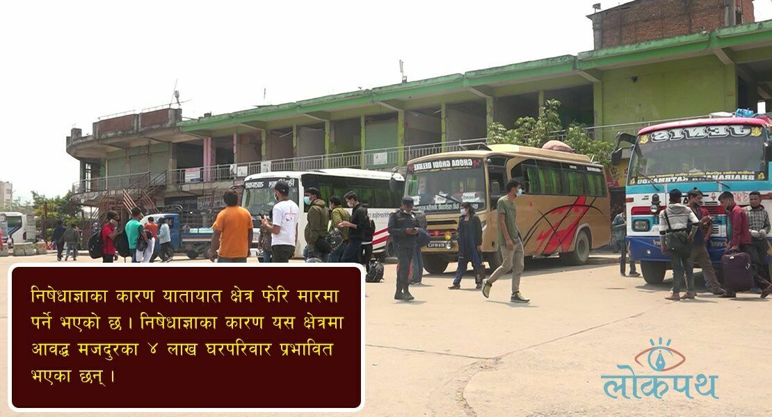 पछिल्लो समय नेपालमा कोरोनाको दोस्रो लहर शुरु भएपछि सरकारले यसबाट बच्न सावधानीस्वरुप वैशाख १६ गते बिहिवारदेखि काठमाडौं उपत्यका लगायत १६ जिल्लामा निषेधाज्ञा गरेको छ। जसका कारण अत्यावश्यक बाहेक सार्वजनिक सवारी साधनहरु गुड्न पाएका छैनन् ।