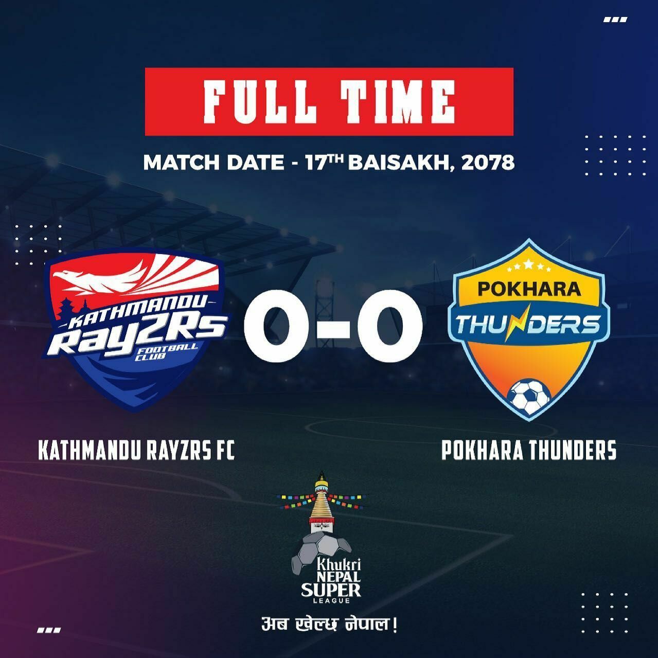 काठमाडौं।  नेपाल सुपर लिग (एनएसएल) अन्तर्गत आज भएको ९औं खेलमा काठमाडौं रेजर्स र पोखरा थन्डर्सले गोलरहित बराबरीमा चित्त बुझाएका छन्।