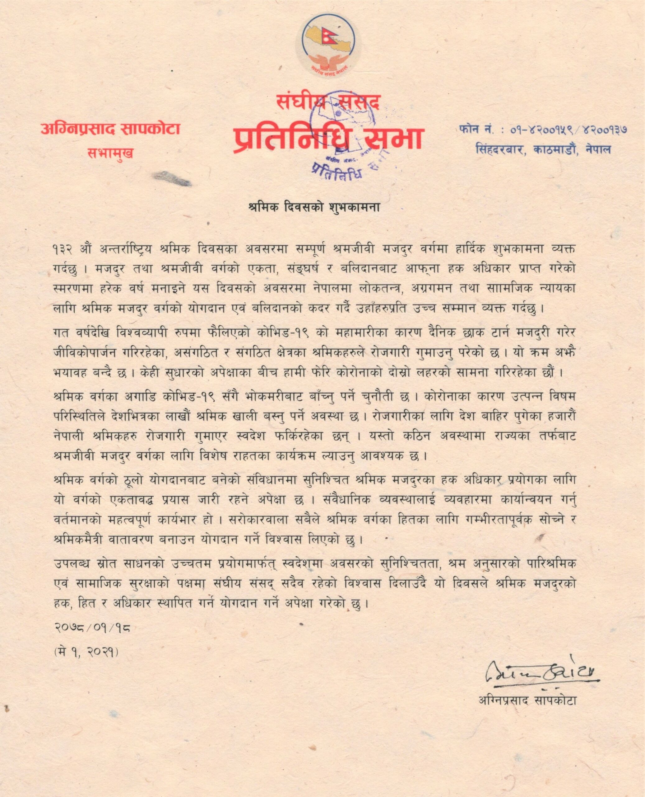 शनिबार १३२ औं अन्तर्राष्ट्रिय श्रमिक दिवसका अवसरमा शुभकामना दिदैँ सभामुख सापकोटाले श्रमिक वर्गका अगाडी कोभिड १९ सँगै भोकमरीसँग बाच्नुपर्ने चुनौति रहेको बताए । कोरोनाका कारण देशभित्रका लाखौं श्रमिक खाली बस्नुपर्ने र देश बाहिर पुगेकाहरुपनि रोजगारी गुमाएर स्वदेश फर्किएको अवस्थामा राज्यको तर्फबाट मजदुर वर्गका लागि विशेष राहत कार्यक्रम ल्याउनु आवश्यक रहेको उनको भनाई छ ।