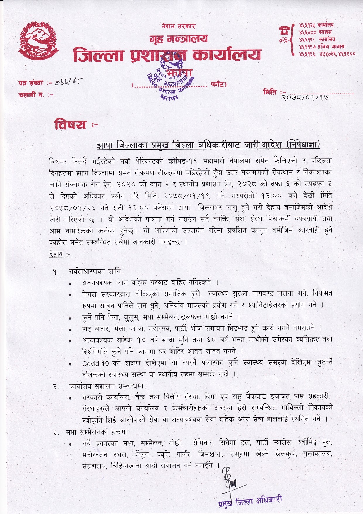 प्रमुख जिल्ला अधिकारी श्रवणकुमार तिम्सिनाले १९ गते मध्य रातदेखी लागू हुने गरि २६ गते सम्मका लागि निषेधाज्ञा जारि गरिएको बताए ।