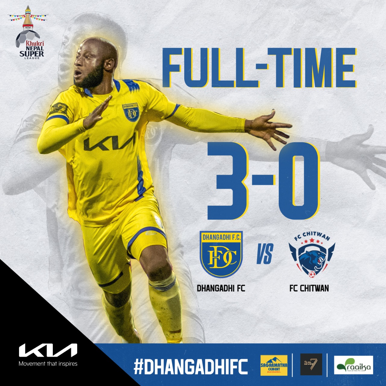 काठमाडौं।  नेपाल सुपर लिग (एनएसएल) मा आज (शनिवार) को पहिलो खेलमा धनगढी एफसीले एफसी चितवनलाई ३-० गोल अन्तरले पराजित गरेको छ।
