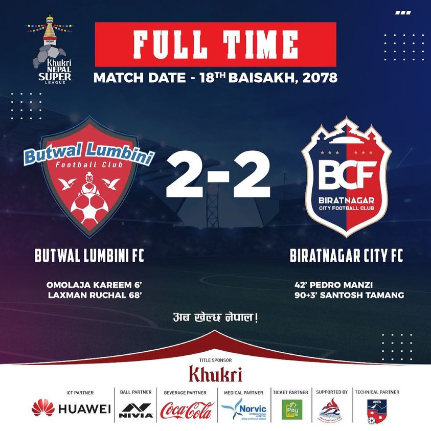 काठमाडौं। नेपाल सुपर लिग (एनएसएल) मा आज (शनिवार) भएको दोस्रो खेलमा विराटनगर सिटी एफसी र बुटवल लुम्बिनी एफसीले २-२ गोलको रोमाञ्चक बराबरी खेल खेलेका छन्।