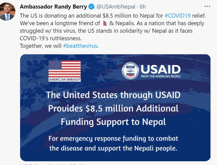 आज अपराह्न ट्विट गर्दै उनले अमेरिकाको पुरानो मित्र नेपाललाई महामारीविरुद्धको लडाइँमा भरथेग गर्न अन्तरराष्ट्रिय विकासका लागि अमेरिकी सहयोग नियोग (युएसएआइडी) मार्फत उक्त रकम उपलब्ध गराइने बताएका हुन् । “कोभिड–१९ विरुद्ध ठूलो सङ्घर्ष गरेको आफ्नो मुलुक नेपालप्रति ऐक्यबद्धता प्रकट गर्दछ, निर्दयी कोरोनालाई परास्त गर्न नेपाल सफल हुनेछ”, उनको ट्विटमा भनिएको छ ।
