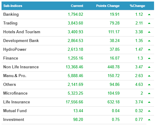 आइतवार सबैभन्दा बढी अन्य उपसमूह ४.६३ प्रतिशशत,जीवन बीमा उसमूह ३.७४ प्रतिशत,निर्जीवन बीमा उपसमूह ३.४७ प्रतिशत र होटल तथा पर्यटन उपसमूहको ३.३८ प्रमतिशतले कारोबार वृद्धि भएको छ । यस दिन २ सय २६ कम्पनीको ८३ हजार ४०४ पटक कारोबार भएको छ ।