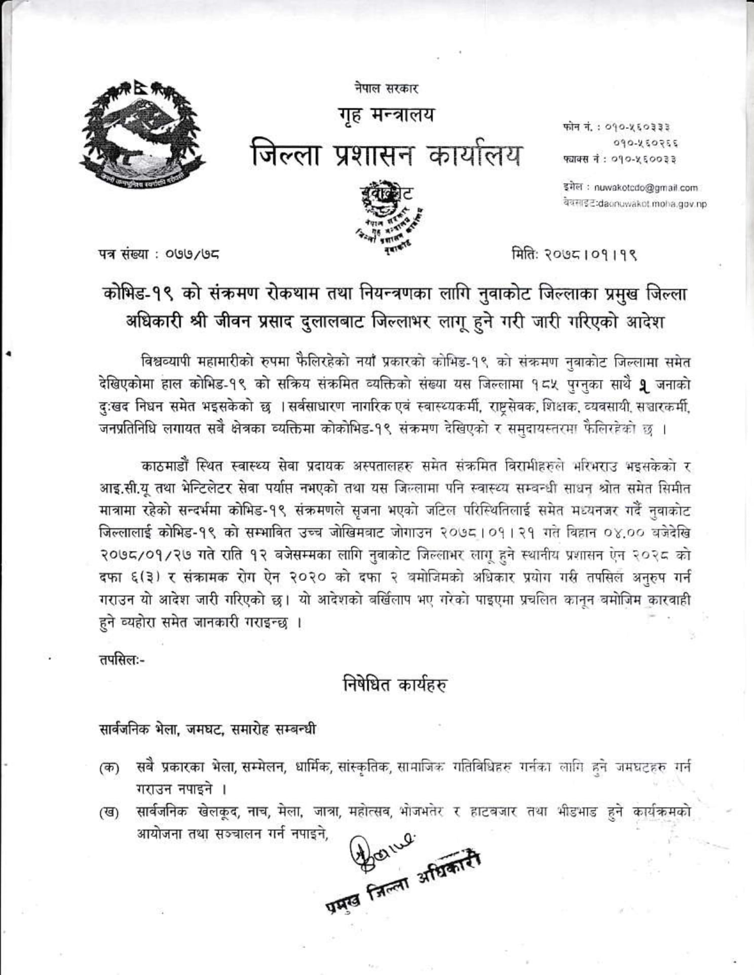 आज जिल्ला प्रशासन कार्यालय नुवाकोटले वैशाख २१ गतेबाट वैशाख २७ गतेसम्म निषेधाज्ञा गर्ने निर्णय गरेको हो ।